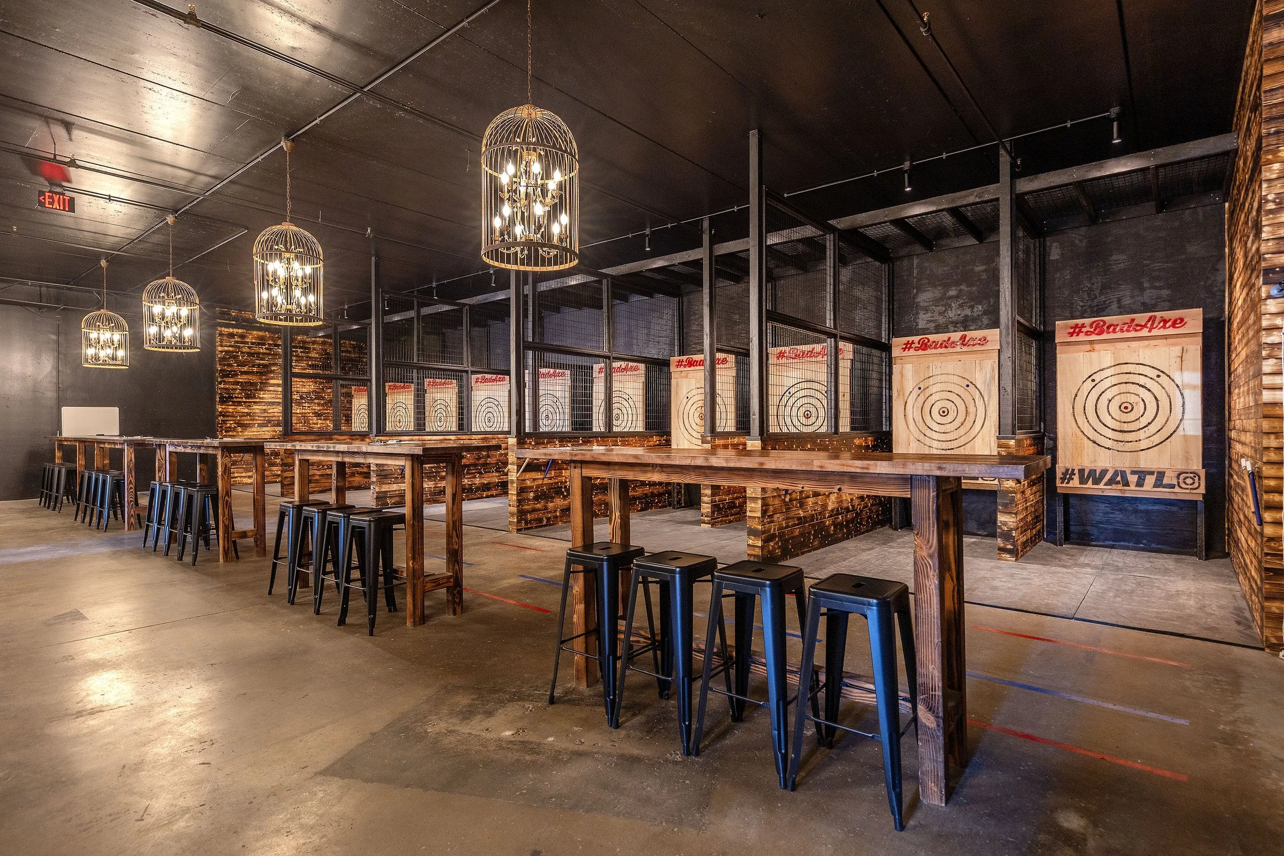 This venue feature a bold, urban-industrial aesthetic that blends rugged outdoorsy elements—like exposed wooden target walls, timber accents, and lumberjack-inspired vibes—with elevated, modern touches, dynamic lighting, and thoughtfully designed spaces that feel artistic and immersive rather than generic.